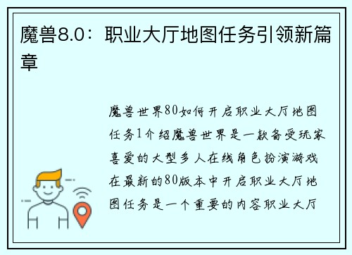 魔兽世界8.0如何开启职业大厅地图任务 1. 介绍 魔兽世界是一款备受玩家喜爱的大型多人在线角色扮演游戏。在最新的8.0版本中,开启职业大厅地图任务是一个重要的内容。职业大厅地图任务为玩家提供了丰富的任务线、奖励和故事情节,是玩家在游戏中进一步发展和提升的重要途径。 2. 职业大厅地图任务简介 职业大厅地图任务是魔兽世界中每个职业专属的任务线。每个职业都有自己独特的大厅地图,玩家可以在其中接受各种...